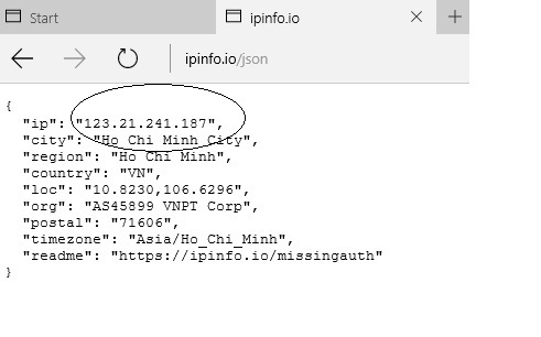 - Step 1: connect to Internet. Search my IP ( in web browser you input url: http://ipinfo.io/json or https://whatismyip.com ... ), example: