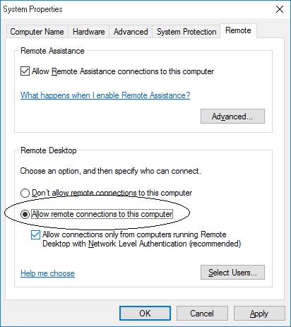 Next, choose [Start/Settings/Control panel/System] in System Properties dialog choose item [Allow remote connections to this computer] like following figura: